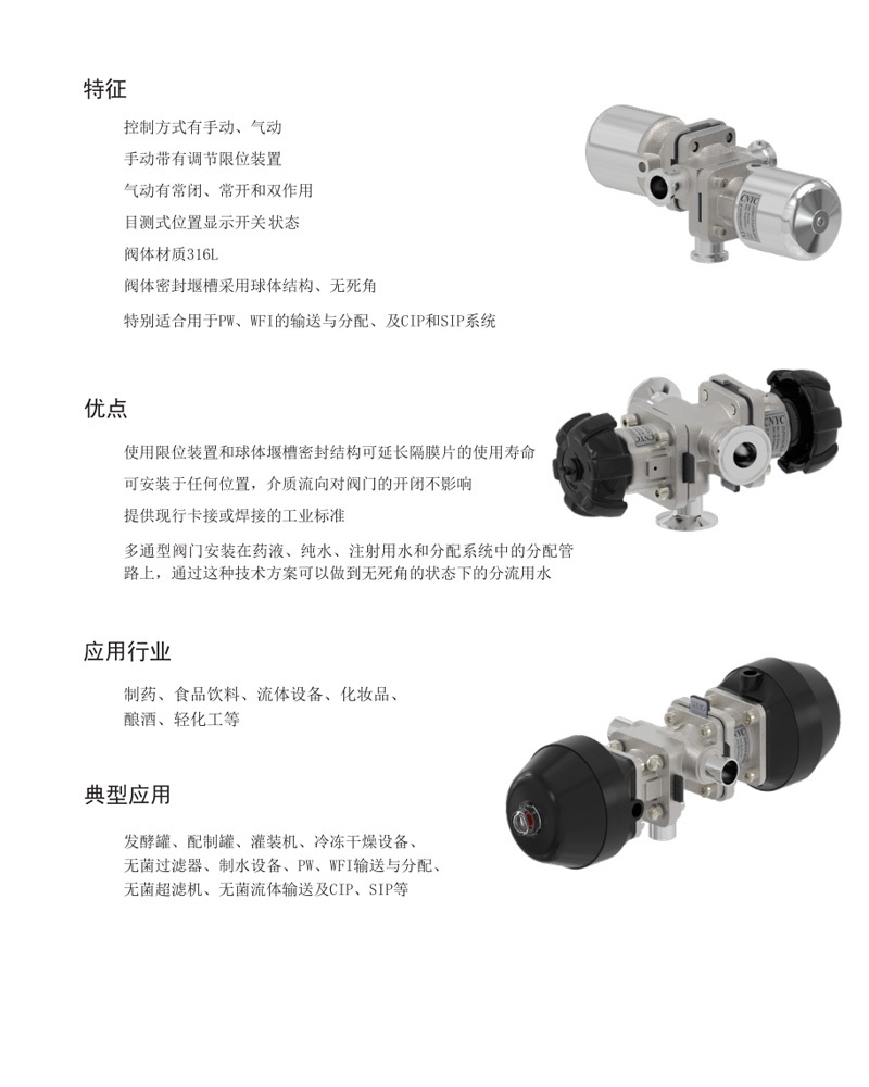 CNYC是公司産(chan)品使用的品牌,系(xi)列産品包括了PTFE+EPDM隔(gé)膜片、隔膜閥、多通(tong)閥、閥門定位器、過(guò)程控制器及位置(zhi)顯示開關等品種(zhong),規格🎯齊備,滿足了(le)FDA、USP、BPE 等相關标準。
